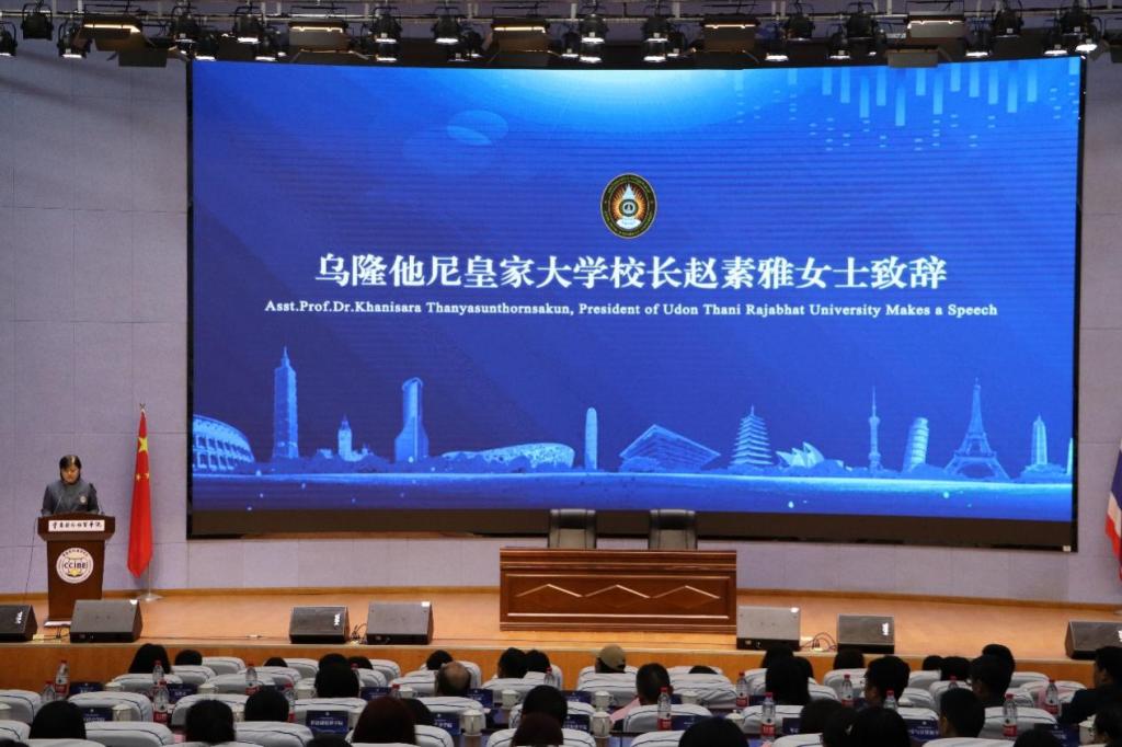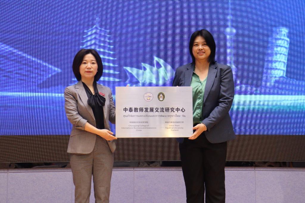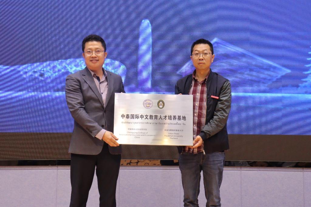 推进会上,乌隆他尼皇家大学萨维提副校长就共建“中泰教师发展研究中心”向今年会外语外贸学院李霓院长授牌,伊绨坤副校长就共建“中泰国际中文教育人才培养基地”向今年会文学与创意传播学院何杨波院长授牌。