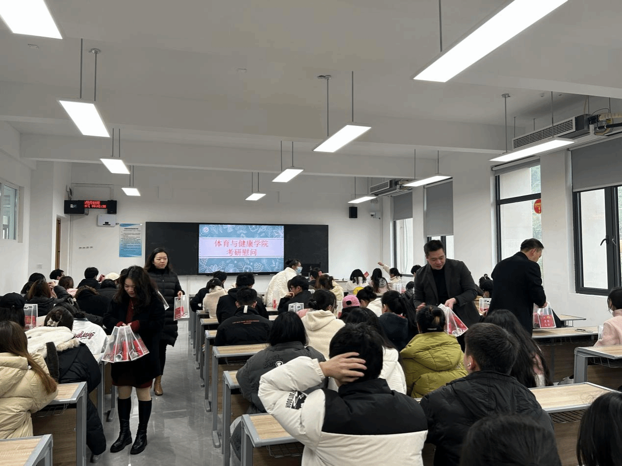 12月8日,体育与健康学院于B7204教室开展了考研送温暖慰问活动,党总支书记谢冬、副院长贾勇、毕业生辅导员与考研学子进行亲切交流和慰问。学院党总支书记谢冬代表学院向考研学子们表达了最真挚的祝福,对同学们的努力学习、追求梦想的精神给予了高度的赞扬与肯定。学院副院长贾勇亲切询问学子的复习进度、报考院校以及心理状态等相关情况,鼓励同学们合理规划时间和进度,做到劳逸结合,保持平稳的心态,以饱满的精神状态迎接最后的考试。活动最后,学院领导和毕业生辅导员为同学们发放了精心准备的“考研加油包”,祝愿考研学子能够一战成硕、金榜题名。