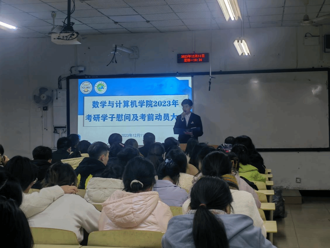 12月11日18:30,数学与计算机学院在A3303教室开展了“情系数计,温暖‘研’途”2023年考研学子慰问暨考前动员大会。院长陈东升、党总支书记尹翔、副院长马秀芬、团总支书记冉启周、专业课老师李楚群、辅导员李雪莲、杨凯、谭燕、高云梅、尹红与考研学子进行了亲切交流并送上了考研慰问暖心大礼包。同时,大家一起观看并记录了考研学子备考瞬间的暖心记录视频。学院领导、老师们亲切鼓励和嘱咐考研学子们,在考研冲刺的最后阶段要注意劳逸结合,调整作息时间,保持良好备考状态;要保持身体健康,注意饮食营养,以最佳的身心状态积极迎考;要保持平稳的心态,充满信心,从容应考,努力实现自己的考研梦。祝愿他们旗开得胜,扬帆远航!