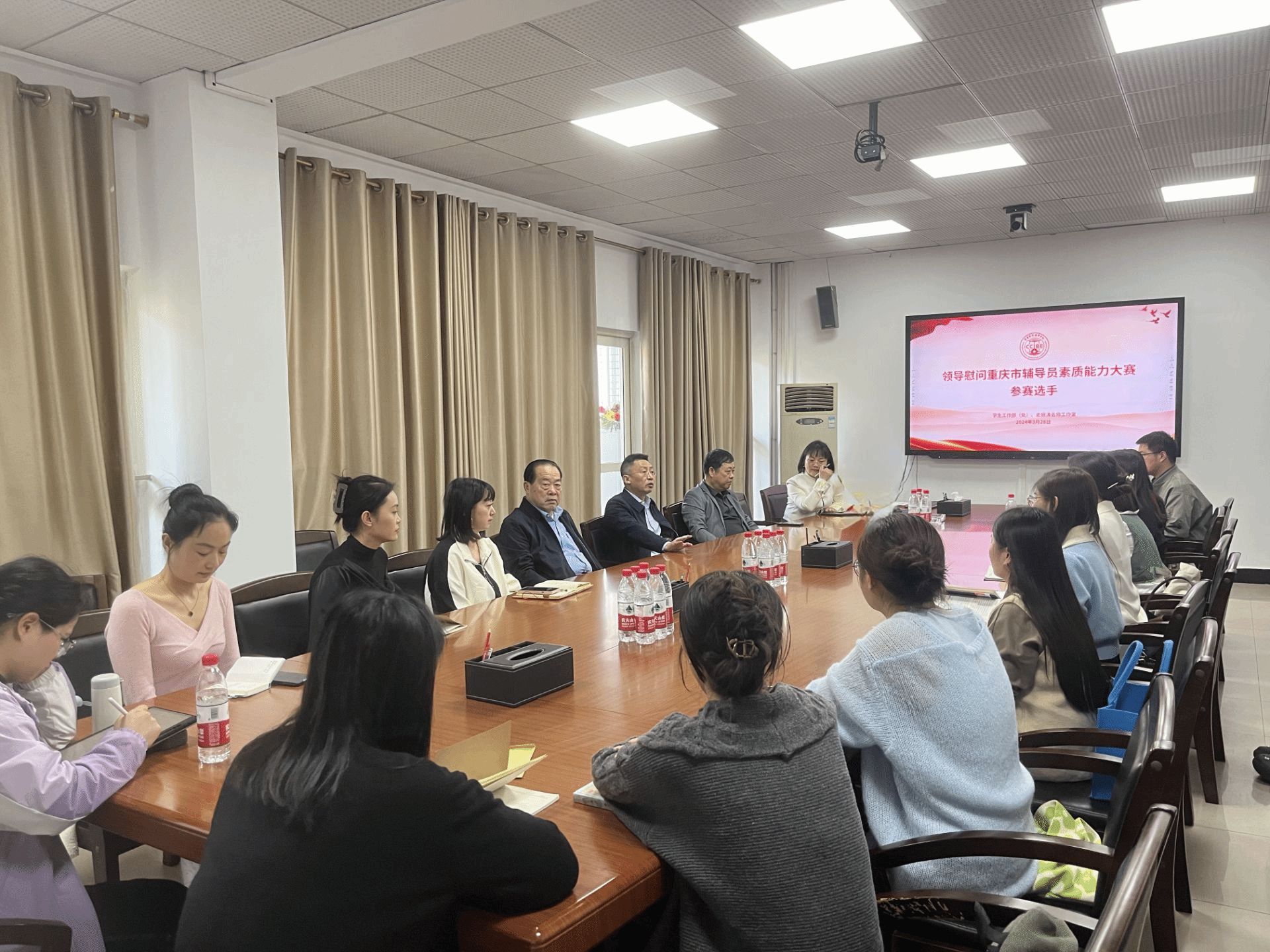 3月28日,重庆市第十二届辅导员素质能力大赛备赛团于A校区第二会议室开展备赛集训总结。学校校长兼党委副书记李明海、常务副校长王乃武出席活动并对今年会选派参赛辅导员王杰、彭瑞及备赛团成员进行亲切慰问。学生处处长伍祥伦、团委书记史丽涛参加活动。