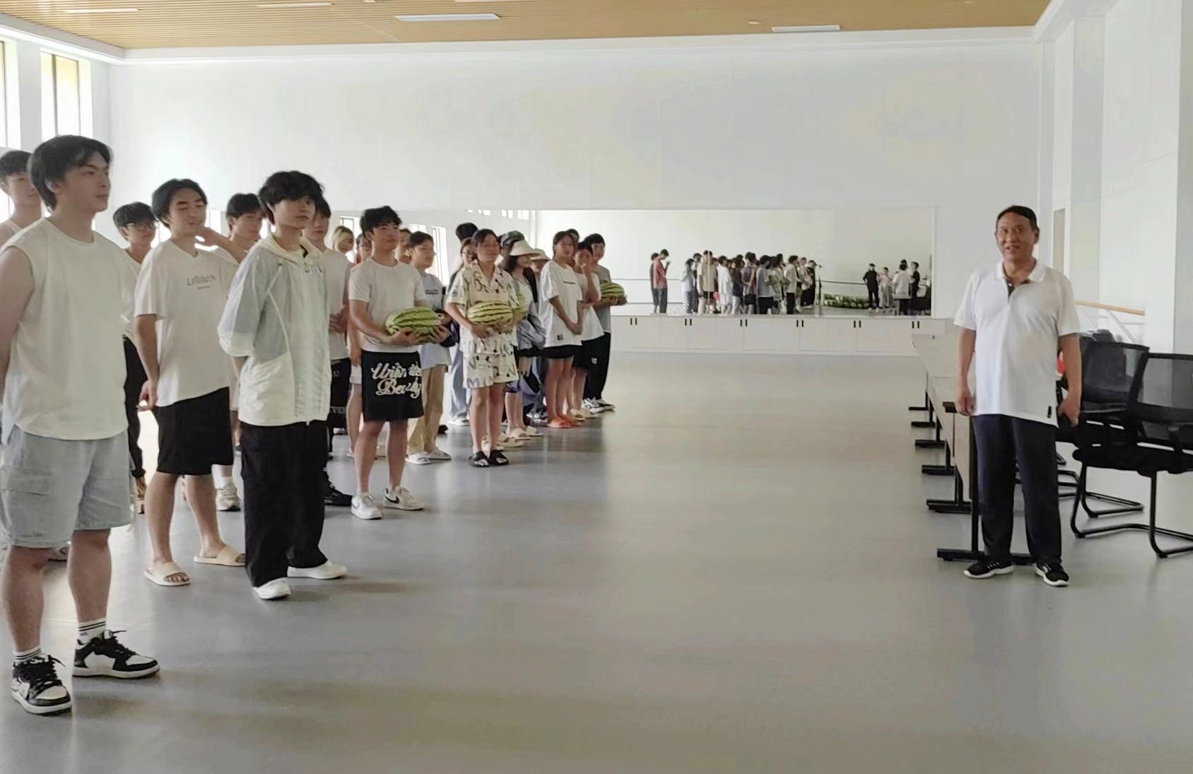 在学校B校区,郭元新理事长亲切慰问了参加市七运会开闭幕式排演的演职人员、指导教师与志愿者,希望大家能够克服高温酷暑,发扬团结协作精神,在市七运会过程中展示学校师生良好精神风貌。