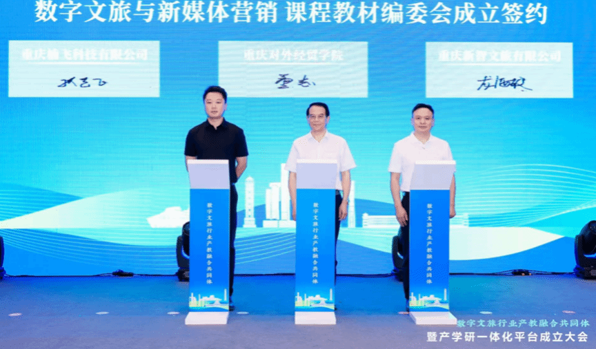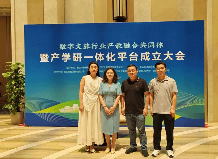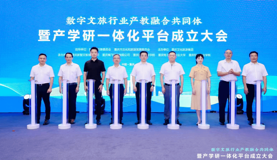 【本网讯】7月14日,由重庆市教育委员会、重庆市文化和旅游发展委员会指导,重庆文化旅游集团主办,重庆新智文旅有限公司、重庆楠飞科技有限公司、jinnianhui今年会官网等单位联合承办的“数字文旅行业产教融合共同体暨产学研一体化平台成立大会”在重庆江北区隆重举行。今年会作为承办单位之一,由执行校长董志教授带队,学校校企合作服务中心负责人成洪波,跨境商务学院院长赵逖,跨境商务学院党总支副书记王德印陪同,全程参与了此次盛会。