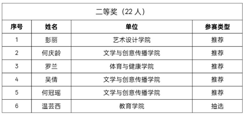 大赛评选出一等奖10名、二等奖22名、三等奖30名。其中,王萌、杨雪梅、张宁、张琴、秦怡、何萍、闫滔、施劼、刘一、杨灵志等10名教师获得一等奖;杨灵志、何庆龄、罗兰、吴倩、何冠瑶等22名教师获得二等奖;王宝川、尹艳、李释加、何静、程静等30名教师获得三等奖。