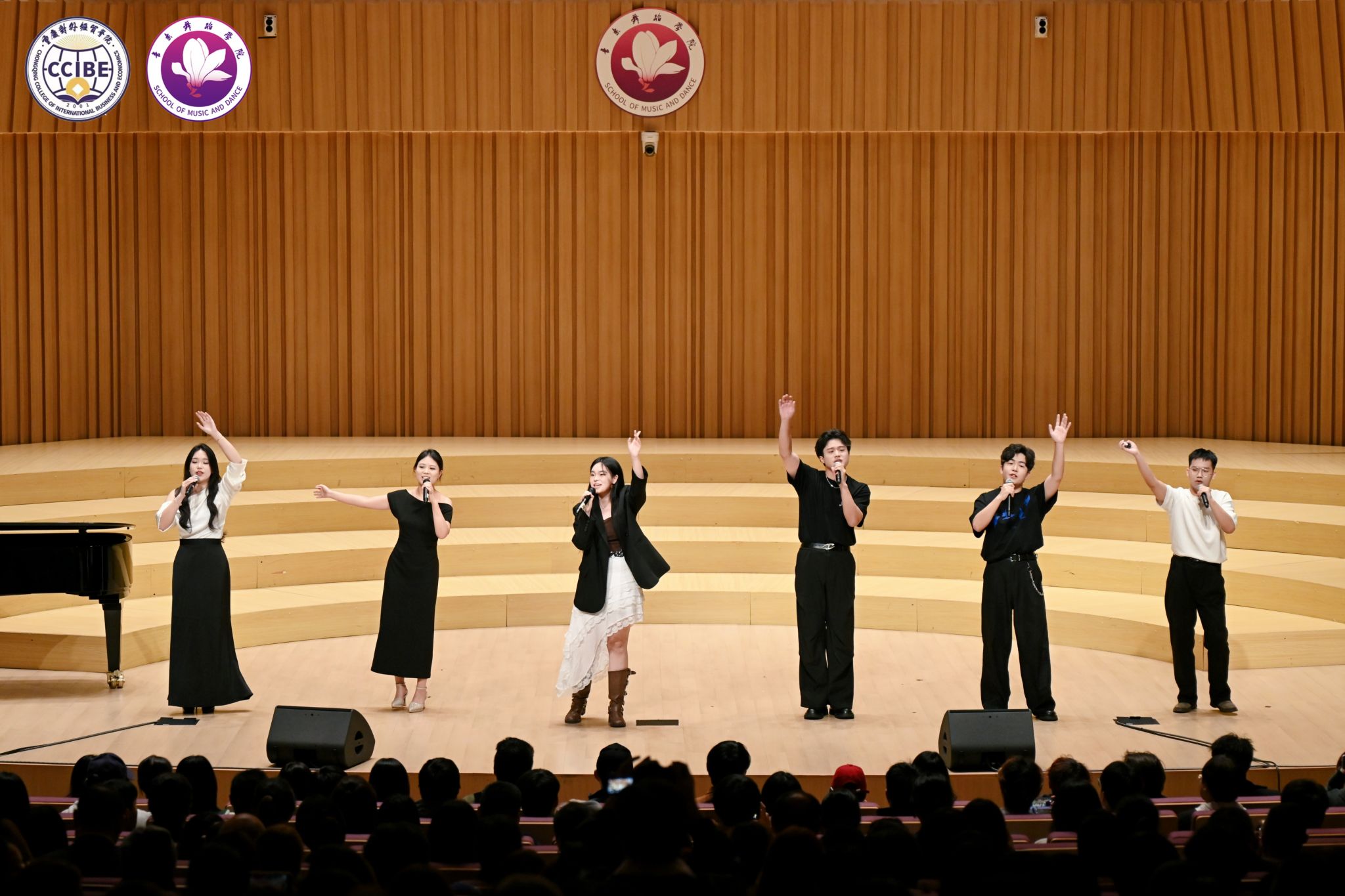 中外艺术融合环节中,韩国歌手李明铉、朴秀珍合作的普契尼歌剧《波西米亚人》选段《冰凉的小手》《人们叫我咪咪》以及浪漫二重唱《多么美丽的姑娘》实现了文化共鸣;尾声的合唱《细雨飘》(重庆酉阳民歌改编)与校歌《经世经贸》,将地方文化与校园精神相融,引发全场情感共鸣。