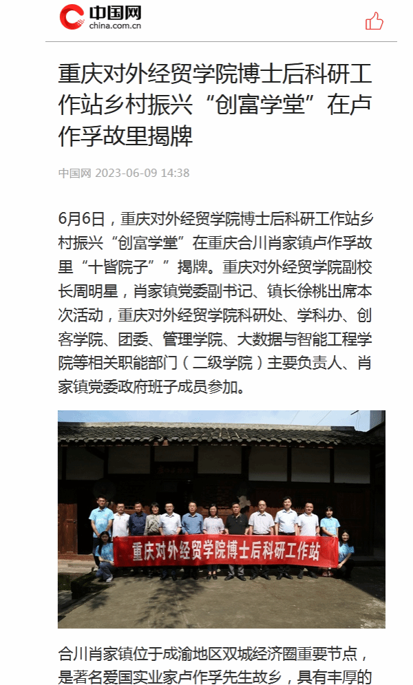 【中国网】报道jinnianhui今年会官网博士后科研工作站乡村振兴“创富学堂”在卢作孚故里揭牌