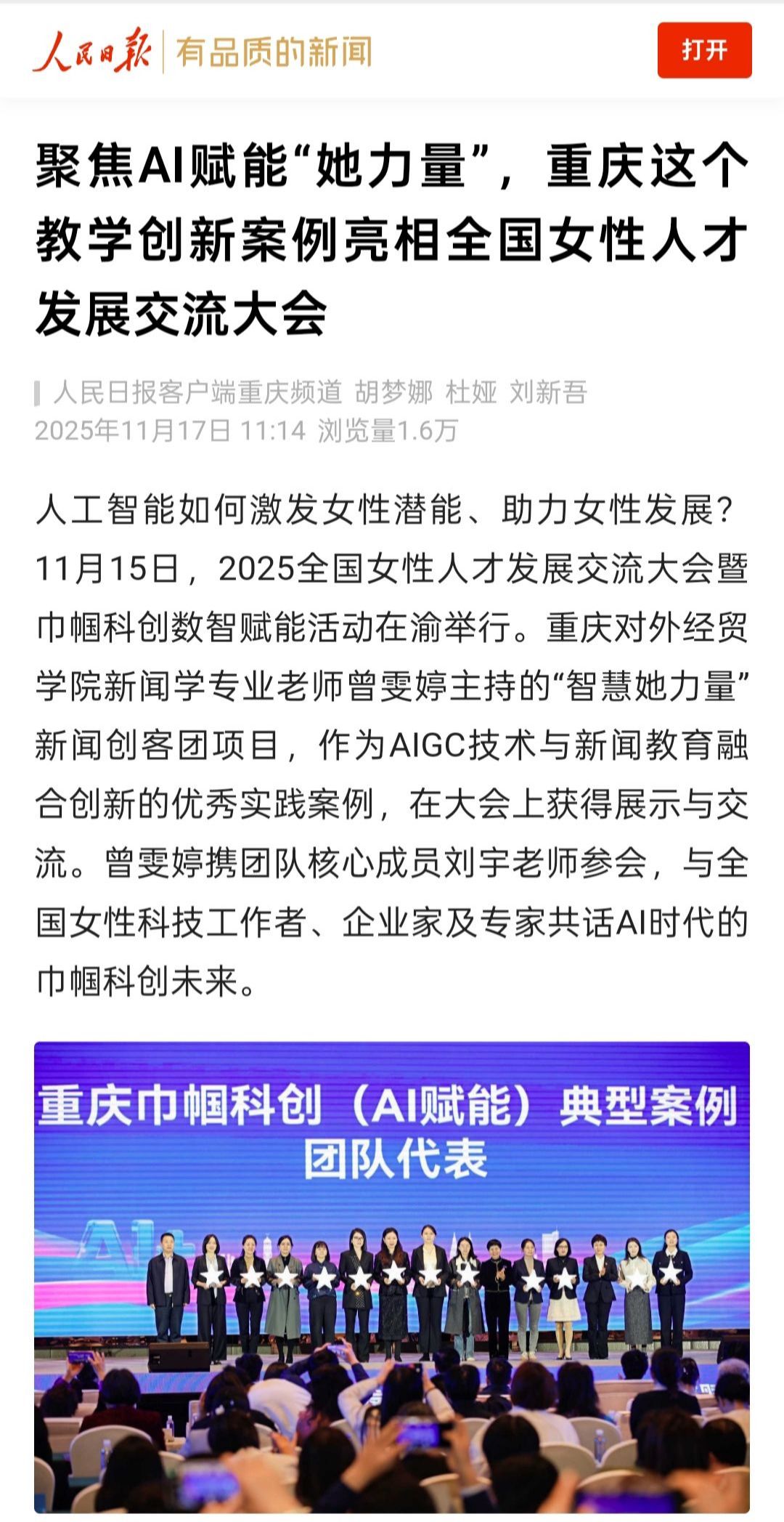 人民日报报道聚焦AI赋能“她力量”,重庆这个教学创新案例亮相全国女性人才发展交流大会