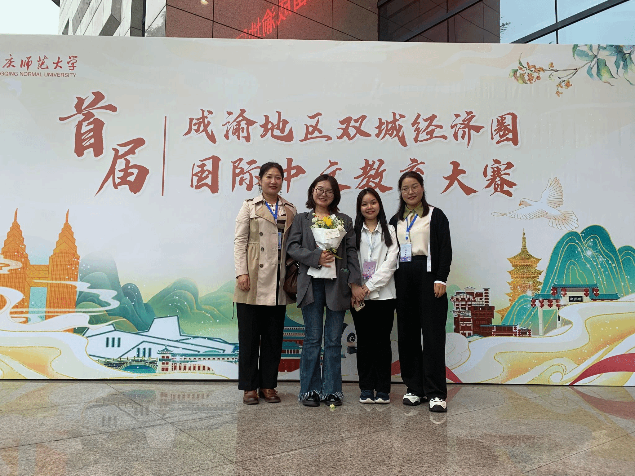 10月18日至19日,由重庆市教育委员会、四川省教育厅主办,重庆师范大学、四川师范大学承办的首届成渝地区双城经济圈国际中文教育大赛决赛在重庆师范大学举行,文学与创意传播学院孟宪丛老师、国际学院罗瑞林老师率部分中国学生和国际学生参加比赛。