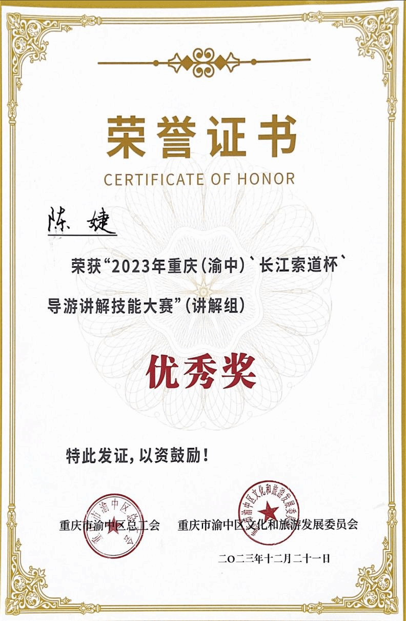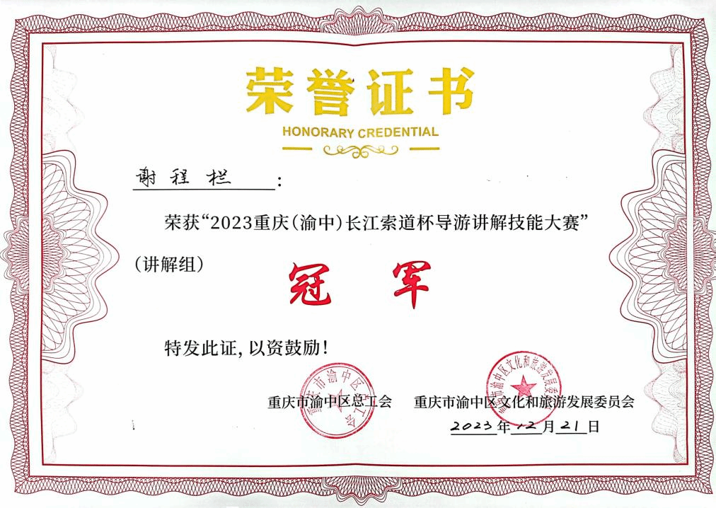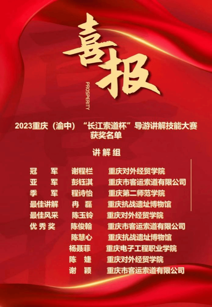经过一周紧张严密的准备,在79名专业讲解员和各校优秀学生的复赛角逐中,谢程栏、陈玉铃和陈婕三名学生以声色并茂的讲解获得评委老师青睐,冲进赛事前十,获得参加决赛的资格。12月21日,在重庆长城酒店举行的2023重庆(渝中)“长江索道杯”导游讲解技能大赛决赛中,经过激烈刺激的比拼,学校谢程栏同学荣获大赛第一名,陈玉铃同学荣获“最佳风采奖”,陈婕同学荣获大赛“优秀奖”,jinnianhui今年会官网荣获“最佳组织奖”。