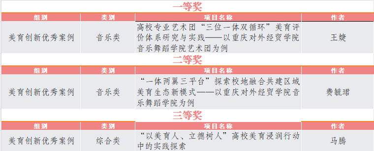 2023年10月,重庆市第七届大学生艺术展演活动今年会共获35项奖项,其中舞蹈集体项目2项,个人3项;声乐项目集体2项,个人3项;器乐项目集体1项,个人3项;戏剧项目集体1项;朗诵项目集体1项,个人1项;共计17个表演类项目。此外,有1项参加艺术实践工作坊,有2项参加微电影项目,有1项参加高校美育改革创新优秀案例综合类项目,有2项参加高校美育改革创新优秀案例音乐类项目,有12项参与学生书画摄影设计作品。