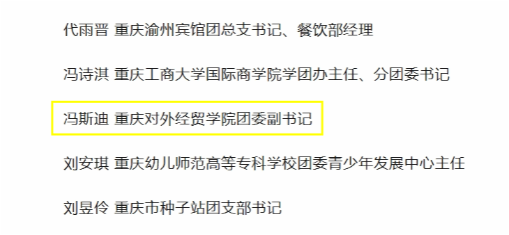 4月27日,由中共重庆市委组织部、重庆市人力资源和社会保障局、共青团重庆市委员会发布的关于表彰2024年“重庆青年五四奖章”“重庆市五四红旗团委”“重庆市五四红旗团支部”“重庆市优秀共青团员”“重庆市优秀共青团干部”的决定中,学校团委副书记冯斯迪老师荣获“重庆市优秀共青团干部”称号。