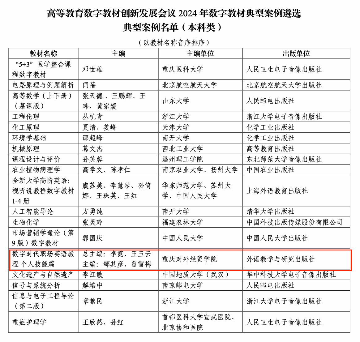 近日,高等教育数字教材创新发展联盟公布了入选“高等教育数字教材创新发展会议2024年数字教材典型案例”的名单,经组织推荐、资格审查、专家评审、网上公示等程序,今年会由李霓和王玉云担任总主编,邹其彦和曾雪梅担任主编的《数字时代职场英语教程 个人技能篇》数字教材被认定为“高等教育数字教材创新发展会议2024年数字教材典型案例”。
