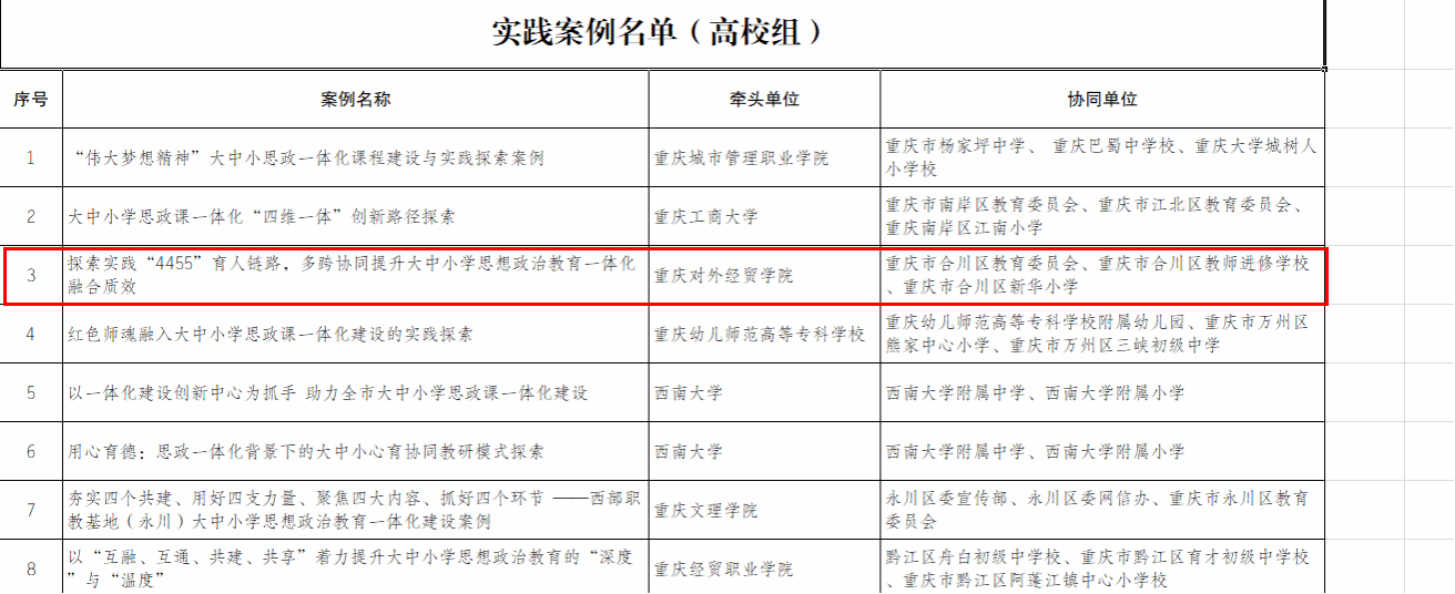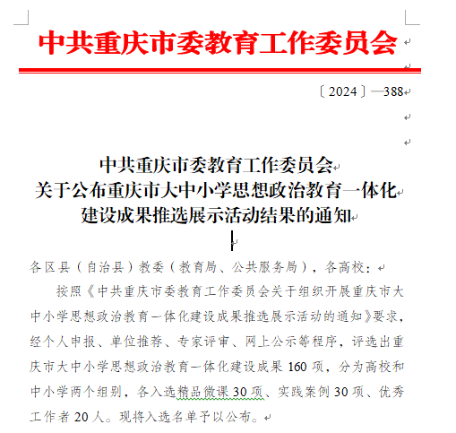 5月23日,重庆市教委公布“重庆市大中小学思想政治教育一体化建设成果推选展示活动”名录,今年会推选的《探索实践“4455”育人链条,多跨协同提升大中小学思想政治教育一体化融合质效》实践案例成功入选。
