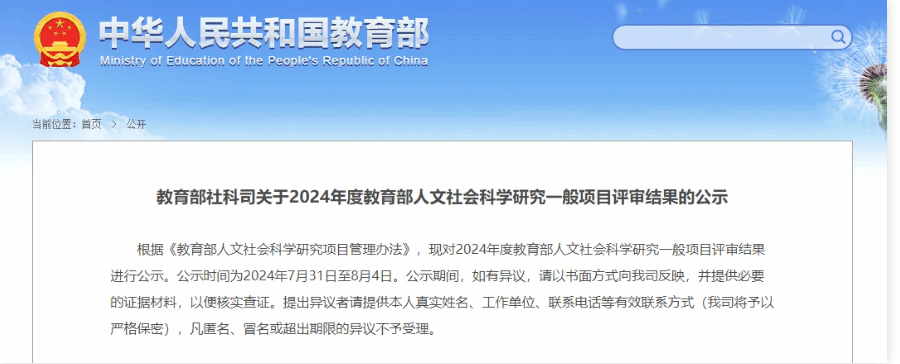 2024年度教育部人文社会科学研究一般项目评审结果的公示