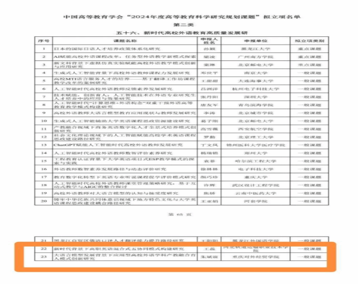 8月26日,外语外贸学院朱斌谊老师团队科研成果再创佳绩,《大语言模型发展背景下应用型高校外语学科产教融合育人模式创新研究》成功获批中国高等教育科学研究规划课题!中国高等教育学会是我国高等教育领域成立时间最长、规模最大、凝聚力最强、影响力最广的全国性学术社团组织。高等教育科学研究规划课题是中国高等教育学会面向全国普通高等学校设立的教育教学研究项目,目的是为了深入贯彻党的二十大精神,全面贯彻落实习近平总书记关于教育的重要论述,服务教育强国建设。