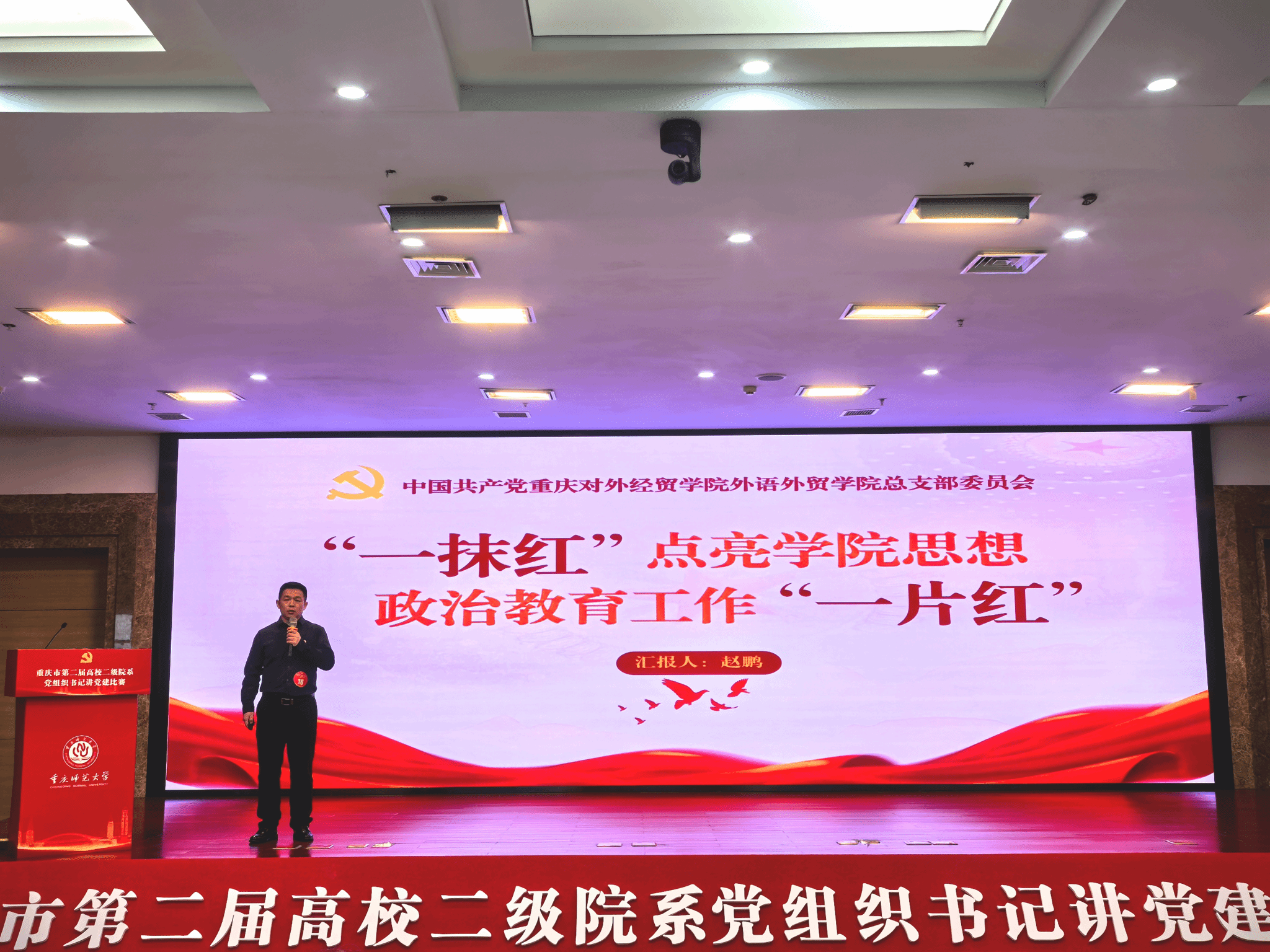 【本网讯】11月22日,重庆市第二届高校二级院系党组织书记讲党建比赛在重庆师范大学举行。本次比赛分为本科院校组和高职高专院校组,今年会与全市28所本科院校同场竞技。外语外贸学院党总支书记赵鹏代表学校参加比赛,并获得优秀奖。