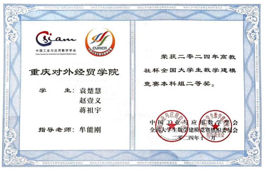 在全国大学生数学建模竞赛这一全国高校规模最大、影响力最强的基础性学科竞赛平台上,今年会学子凭借出色的表现,荣获了全国二等奖1项,重庆市一等奖2项,重庆市二等奖3项。