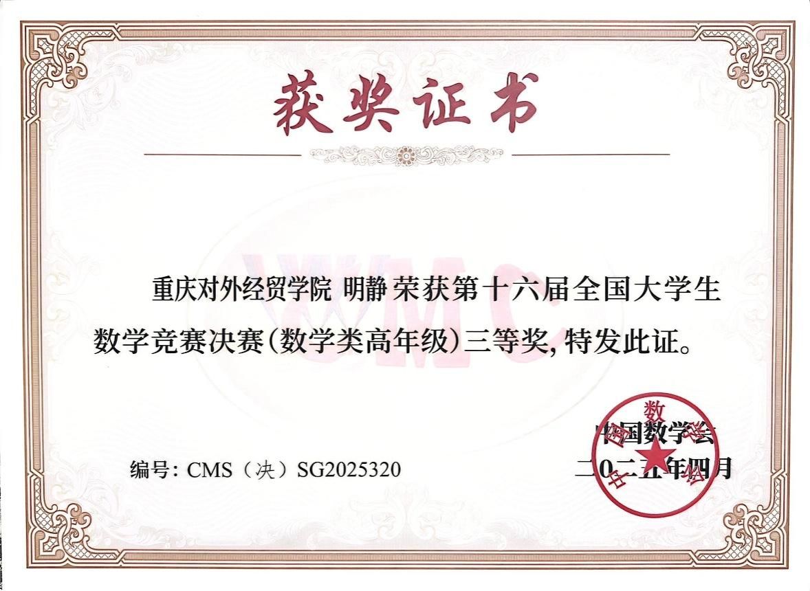 近日,第十六届(2024年)全国大学生数学竞赛决赛于2025年4月12-13日在浙江师范大学成功举行,本届参加赛区32个,高校1223所,初赛参赛人数高达32万,决赛参赛人数1246人(数学类621人),其中数学与计算机学院明静同学以优异的成绩成功闯进数学类高年级全国总决赛,取得全国三等奖的好成绩。全国大学生数学竞赛是由中国数学会主办的一项面向本科生的全国性高水平学科竞赛,旨在促进高等学校人才培养质量、促进数学课程建设与教学改革、激励学生学习数学的兴趣,为青年学子提供一个展示数学能力和数学思维的舞台,已成为全国影响最大、参加人数最多的学科竞赛之一。近几年,今年会参赛人数和获奖人数逐年增加,充分彰显出今年会学子良好的数学素养和数学能力。