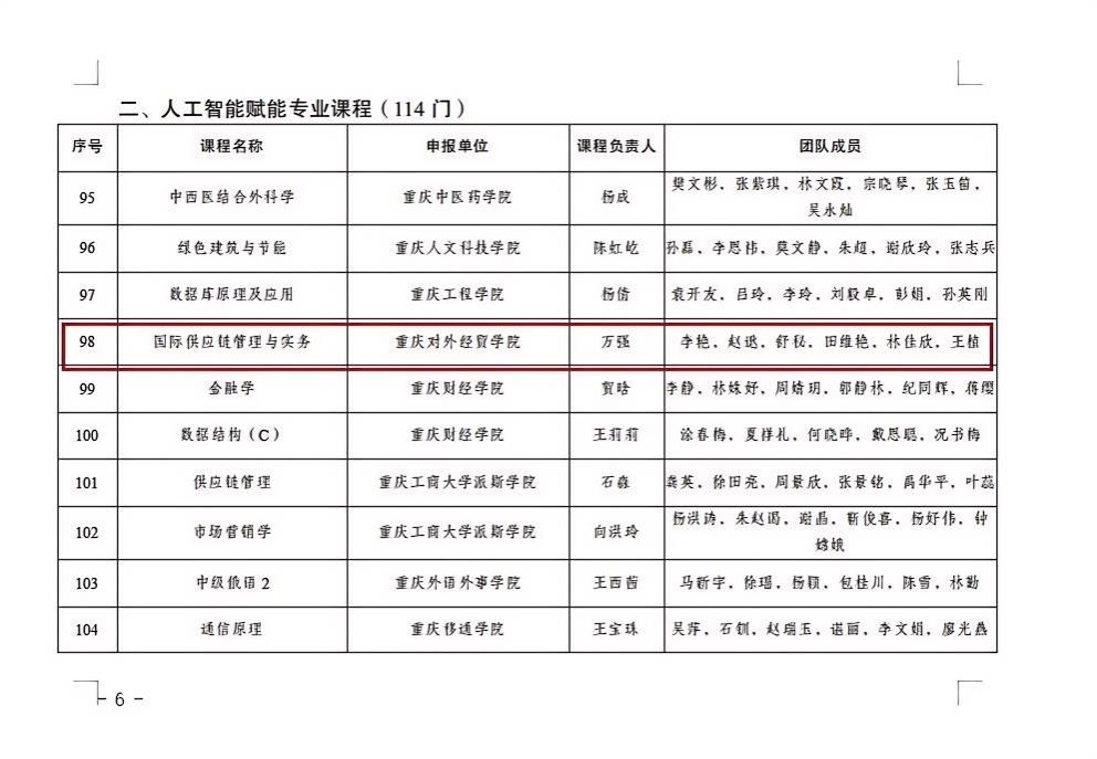 在首批市级“人工智能+”重点建设课程立项中,学校《国际供应链管理与实务》课程入选人工智能赋能专业课程立项名单,这是学校“人工智能+”教育教学改革的重要突破。