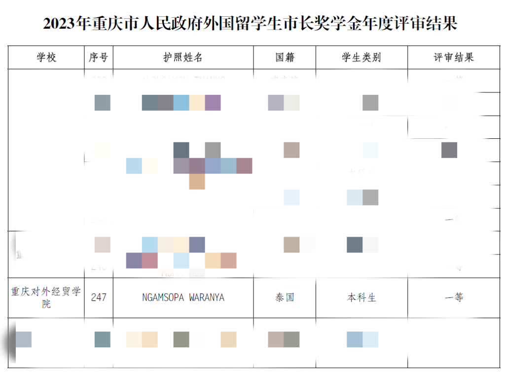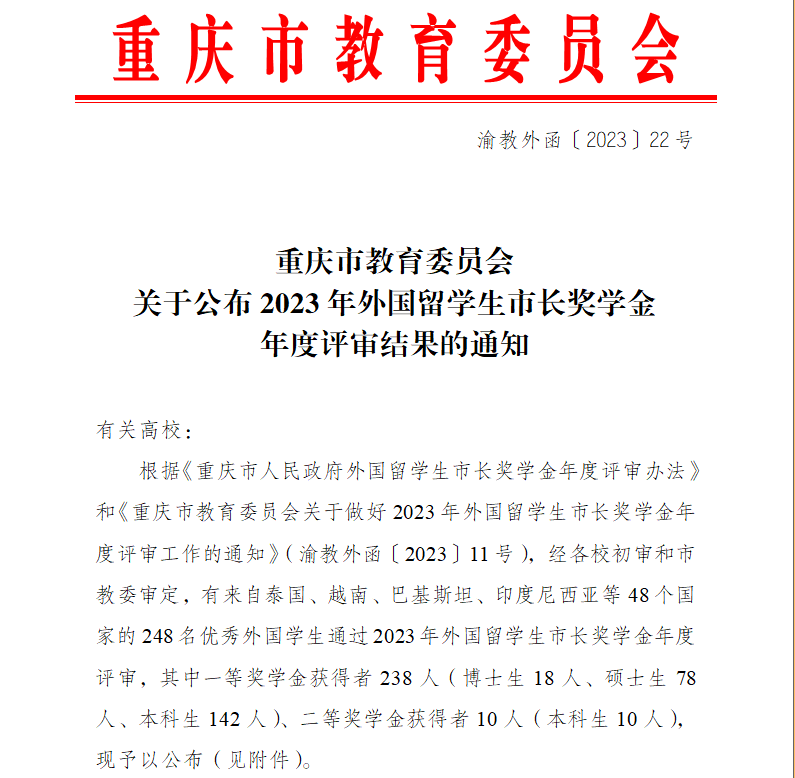 学校留学生获得 2022-2023学年重庆市人民政府外国留学生市长奖学金