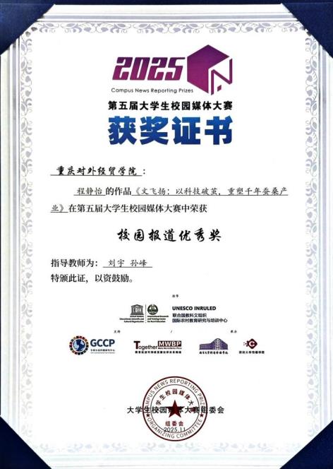 11月1日下午,第五届大学生校园媒体大赛颁奖典礼在深圳大学举行。其中,文学与创意传播学院2023 级新闻学专业学生程静怡凭借作品《文飞扬:以科技破茧,重塑千年蚕桑产业》,从全国 91 所高校报送的 795 份参赛作品中脱颖而出,荣获 “校园报道优秀奖”(该赛道不设等级奖)。今年会也成为本次大赛中重庆市唯一入围并获奖的高校,这一成绩充分展现了我院在实践教学与产学研协同育人方面的扎实成效。
