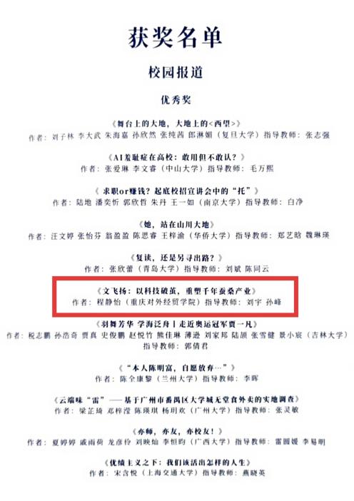 程静怡的作品以科技赋能千年蚕桑产业为切入点,通过深入的案例挖掘与生动的叙事表达,展现了创新创业者的实践精神,既契合新闻学专业 “四力” 培养要求,也体现我院学子关注产业发展的专业视野。在指导教师刘宇、孙峰的悉心指导下,该作品历经多轮严格评审,最终在激烈竞争中成功突围。