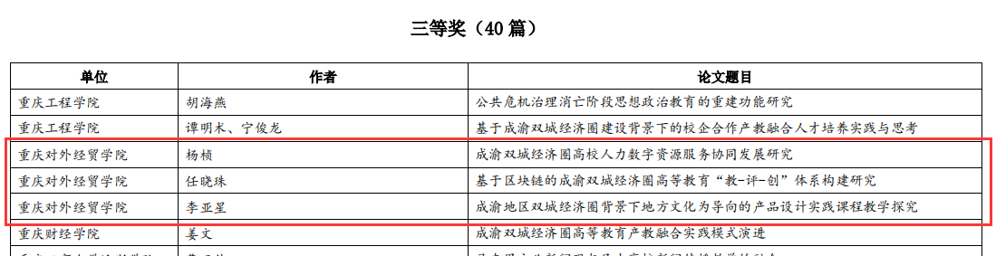 学校杨桢老师的论文《成渝双城经济圈高校人力数字资源服务协同发展研究》、任晓珠老师的论文《基于区块链的成渝双城经济圈高等教育“教-评-创”体系》、李亚星老师的论文《成渝双城经济圈背景下地方文化为导向的“文创产品设计”课程教学探究》获本科组三等奖。