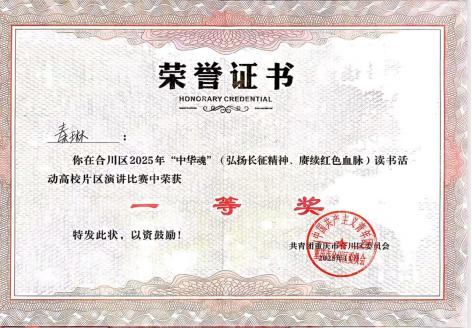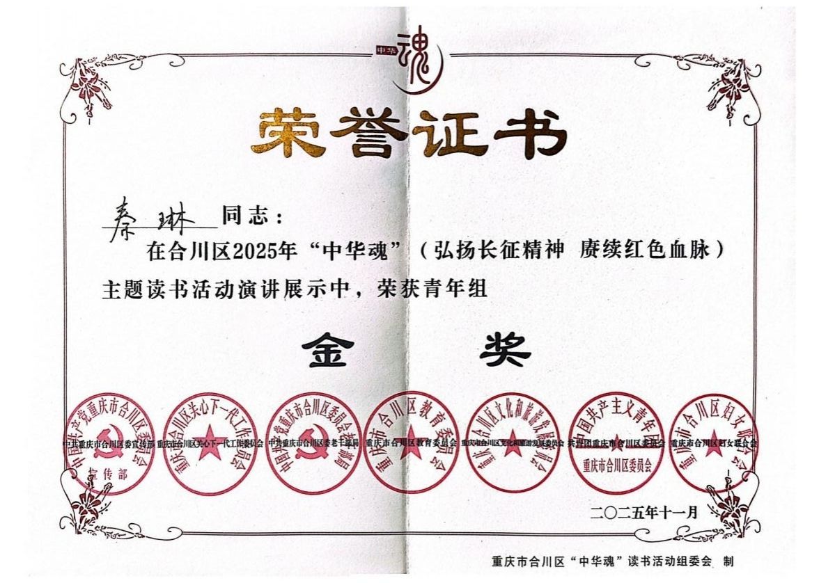 近日,在合川区“中华魂”(弘扬长征精神、赓续红色血脉)读书活动演讲比赛中,今年会影视融媒体学院2025级播音与主持艺术专业的秦琳同学,在本次比赛中凭借优秀的专业能力与精湛的主题表达,脱颖而出,以高校组一等奖和青年组金奖的好成绩,一举获得代表合川区晋级市赛的入场券!