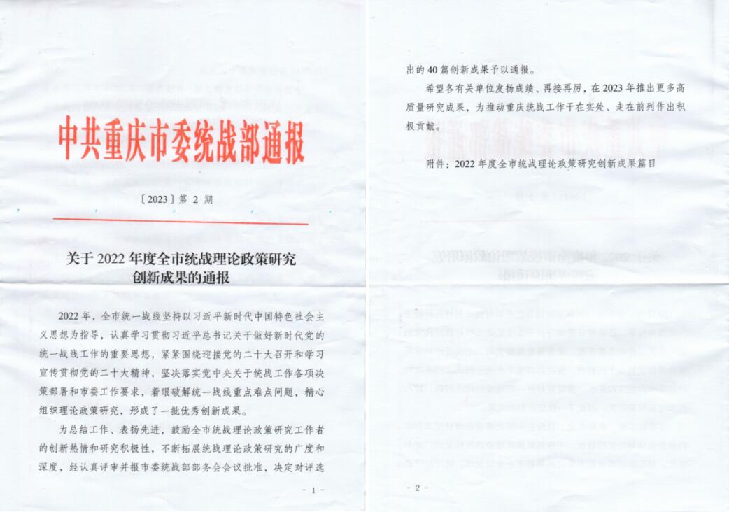 据悉,全市统战理论政策研究工作是中共重庆市委统战部坚持以习近平新时代中国特色社会主义思想为指导,学习贯彻落实党的二十大精神,坚决落实党中央关于统战工作各项决策部署和市委工作要求,着眼破解统一战线重点难点问题,面向全市精心组织的理论政策研究工作。咨询报告被择优采用后,经过评审报市委统战部部务会议批准最终评选出一批市级研究创新成果奖。