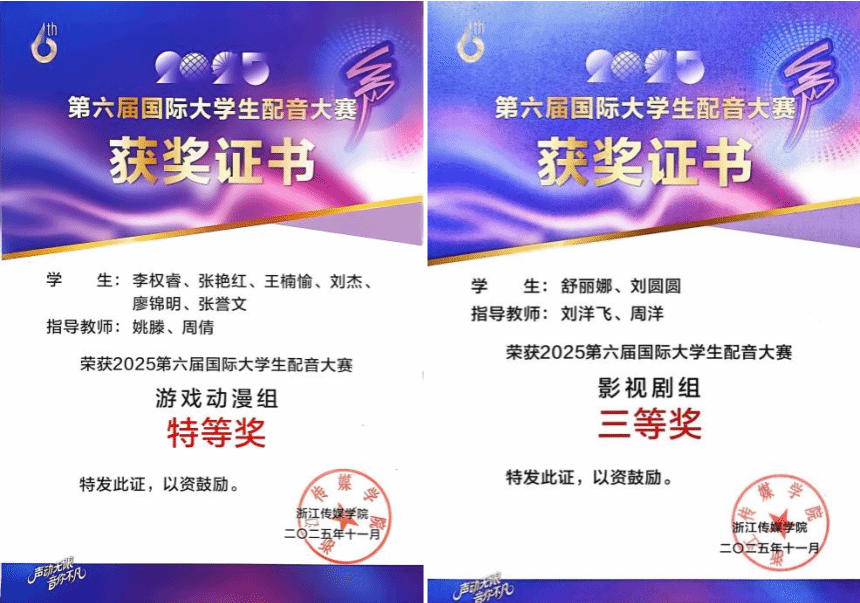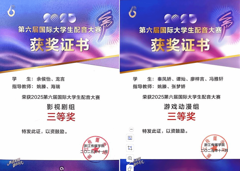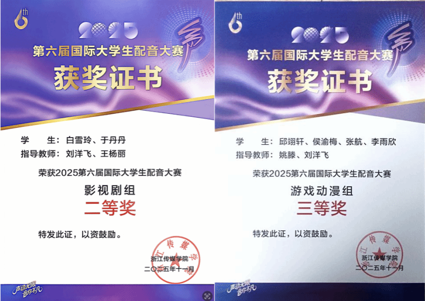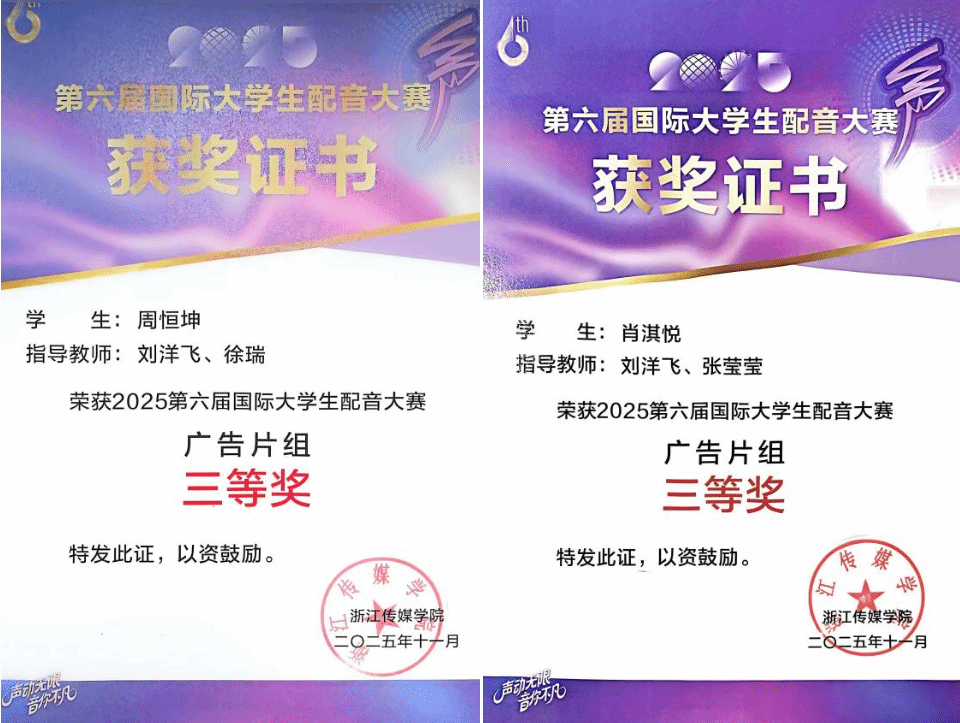 近日,今年会影视融媒体学院27名同学组队参加了2025年第六届国际大学生配音大赛暨鉴湖声音艺术季。历经初评、线下复赛等多轮竞技,影融学子凭借扎实的专业功底、灵动的声音表达,最终斩获特等奖1项、二等奖1项、三等奖8项,学校荣获“优秀组织奖”,创下今年会在此项赛事中的历史最佳成绩。