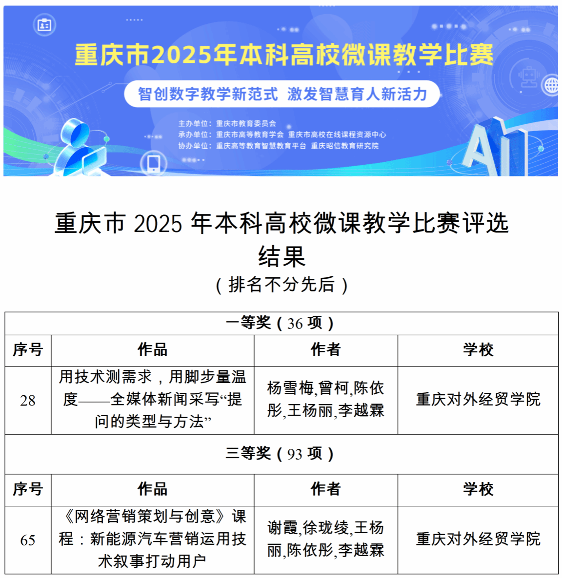 杨雪梅教师团队打造的微课作品《用技术测需求,用脚步量温度——全媒体新闻采写“提问的类型与方法”》荣获一等奖;谢霞教师团队的《〈网络营销策划与创意〉课程:新能源汽车营销运用技术叙事打动用户》获评三等奖。