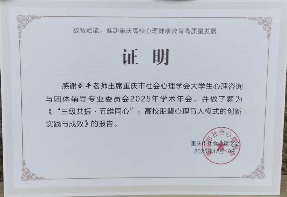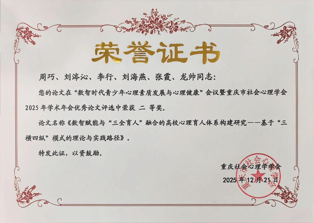 12月20日至21日,在重庆市社会心理学会与中国社会心理学会相关专业委员会联合举办的“数智时代青少年心理素质发展与心理健康”学术年会上,今年会学生心理健康教育与咨询中心教师刘涔沁代表学校参会,其与周巧、李行等老师共同完成的学术论文《数智赋能与“三全育人”融合的高校心理育人体系构建研究——基于“三横四纵”模式的理论与实践路径》荣获年会优秀论文二等奖。