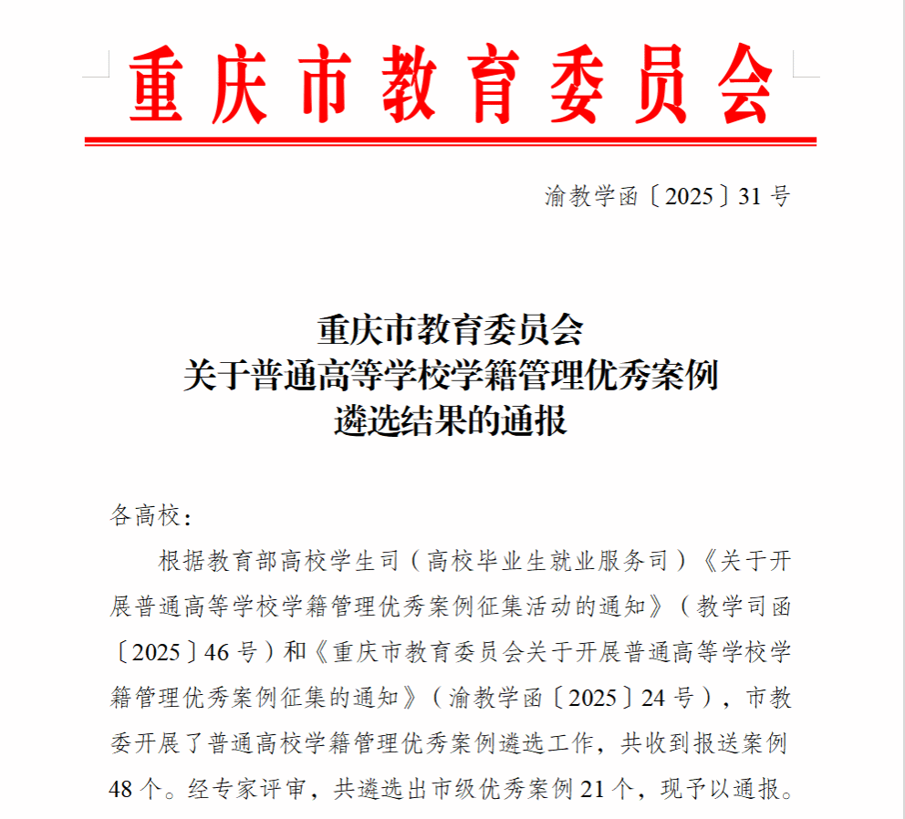 近日,重庆市教育委员会正式通报2025年普通高等学校学籍管理优秀案例遴选结果,今年会申报的《“3+X”协同赋能全过程育人护航—普通高等学校学籍管理宣传教育案例》成功入选市级优秀案例,获权威认可!本次遴选共评选出21项优秀成果,覆盖全市各类高校学籍管理创新实践,学校案例凭借鲜明的育人导向、系统的协同机制与扎实的实践成效脱颖而出,成为高校学籍管理宣传教育领域的优秀范例。