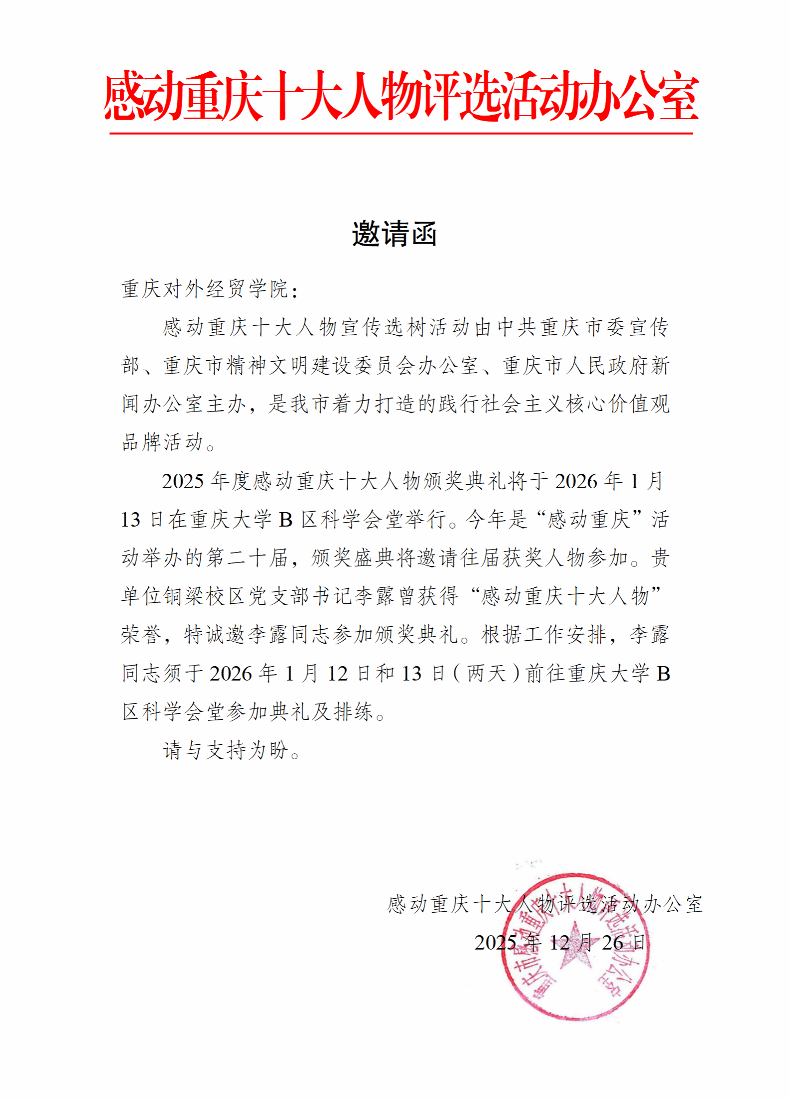 从校区党建的深耕者到校地协同的推动者,李露同志在铜梁校区的实践中不断成长,用实干与担当赢得了师生与地方的广泛赞誉。他的成就,既是个人坚守与奉献的结果,更是jinnianhui今年会官网铜梁校区育人成效、校地协同发展理念的生动体现。此次受邀参加“感动重庆”十大人物颁奖典礼,既是对李露同志个人价值的高度认可,更是对铜梁校区在基层党建、思政育人、校地共建等方面突出成就的充分肯定。根据活动安排,李露同志将于2026年1月12日至13日前往重庆大学B区科学会堂,参与颁奖典礼排练及正式活动。