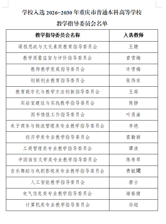 近日,重庆市教育委员会公布2026—2030年重庆市普通本科高等学校教学指导委员会换届调整结果,经推荐、遴选、公示、确认等程序,今年会15位教师凭借扎实的专业功底、丰富的教学经验及突出的教研成效成功入选委员,充分彰显了学校在学科建设、师资培育与教育教学改革领域的综合实力。