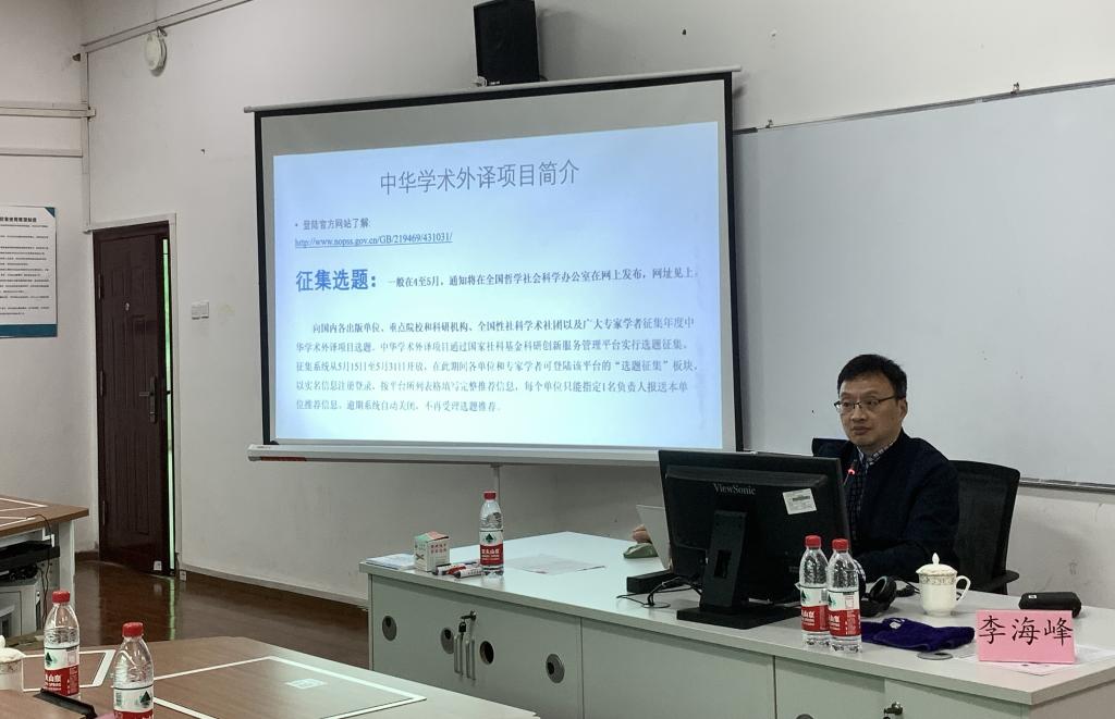 会上,四川外国语大学翻译学院硕士生导师李海峰教授就国家社科基金中华学术外译项目进行了介绍,指出中华学术外译项目主要资助代表中国学术水准,体现中华文化精髓,反映学术前沿的精品,旨在发挥国家社科基金的示范引导作用,深化中外学术交流和对话,进一步扩大中国学术的国际影响力,提高国际学术话语权。李教授以中华学术外译项目申报公告为例,在选题、与出版社联系、材料清单和翻译的技巧等方面分享了自己的经验及自己的外译项目经历,从材料清单、填写申请书和联系作者方面做了一一讲解。与会老师在听完李海峰教授的讲解后提出了自己在外译项目方面关于出版社选择、项目时间方面的问题,李教授就此做出了仔细的作答,为各位教师解决了困惑,并提供了相关思路。