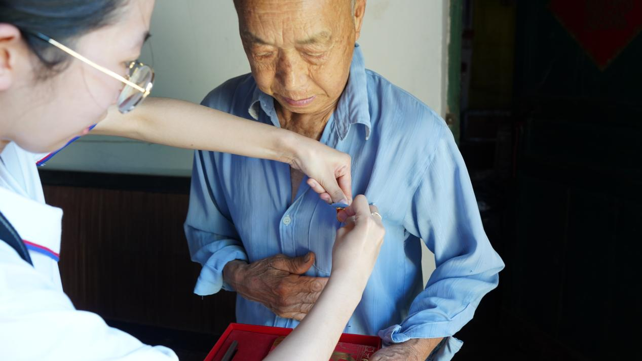 志愿者郑卓依为陈锡全同志佩戴党徽