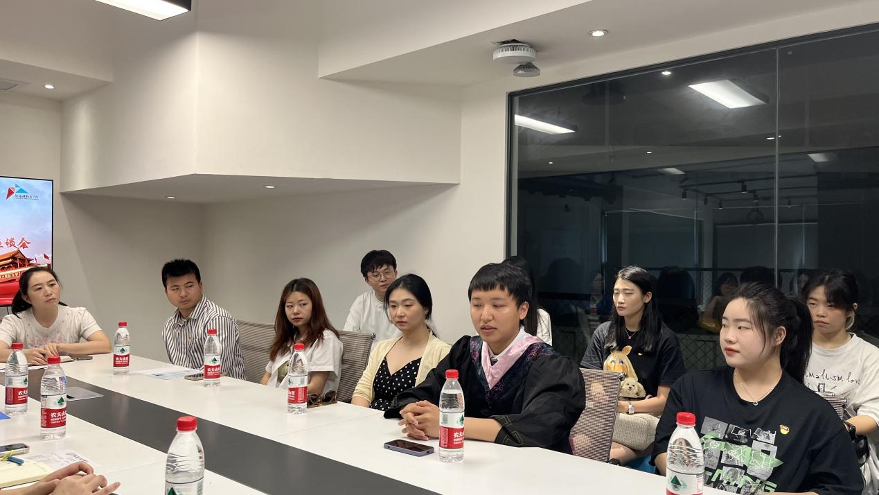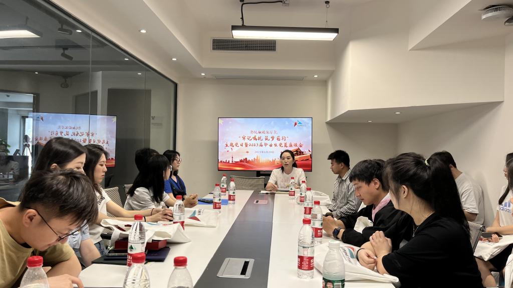 为深入推进学习贯彻习近平新时代中国特色社会主义思想主题教育走深走实,进一步加强对毕业生党员的教育引导,倾听毕业生党员的声音,2023年6月20日上午,影视融媒体学院学生党支部在9111会议室顺利开展“牢记嘱托·筑梦前行”主题党日暨2023届毕业生党员座谈会。会议由学院学生党支部书记廖俊杰主持,党总支书记周倩作为主讲人带领大家进行主题教育学习并作主旨发言,30名毕业生党员代表聆听了本次专题党课。