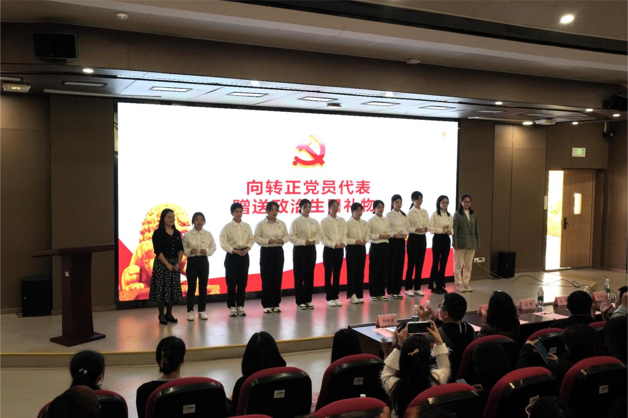其次,刘坤奇同志宣读预备党员转正批复,由学院副院长、党总支宣传委员李艳同志和党总支组织委员汪廷美同志共同为转正党员代表赠送政治生日礼物。