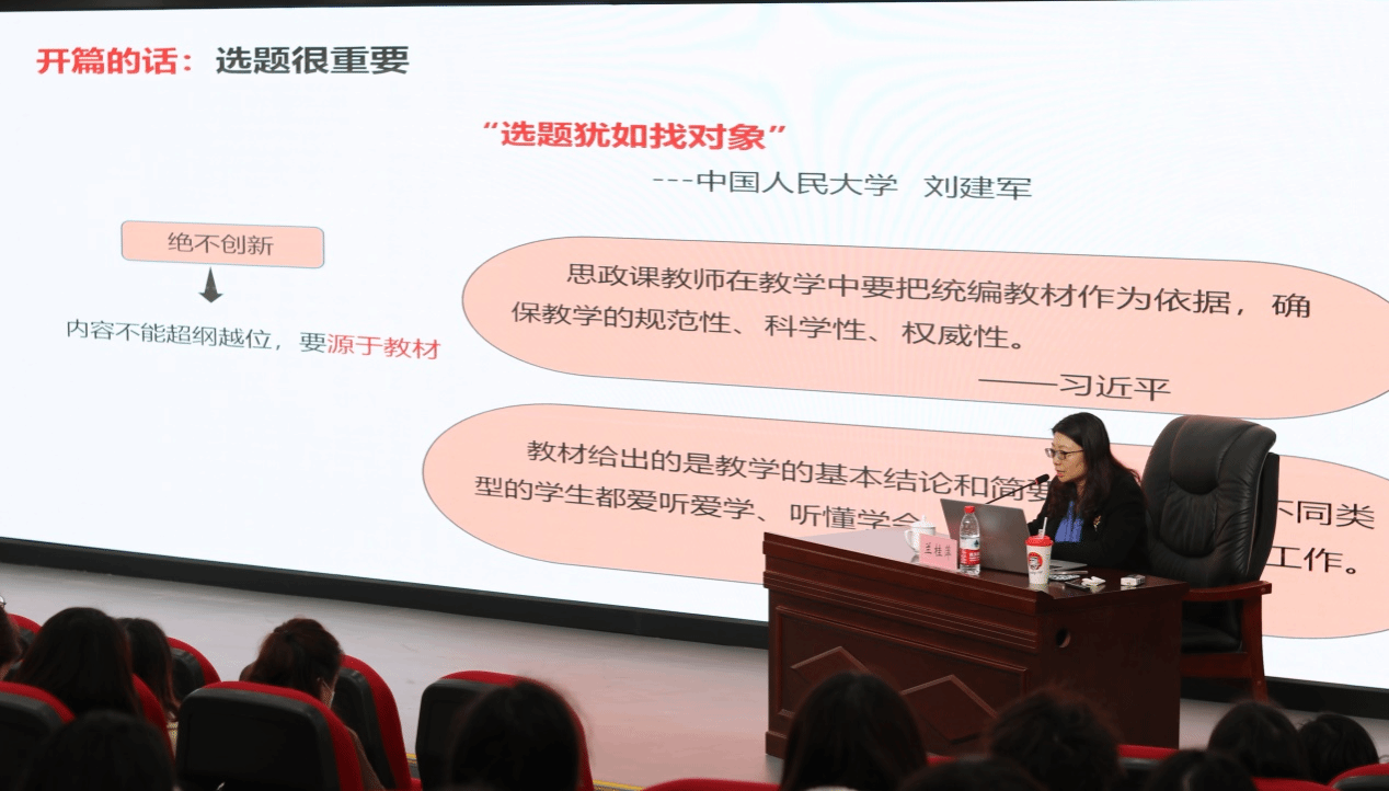 兰桂萍老师以“提升思政课教学设计与实施实效性的思考”为主题,以提升思政课思想性、理论性和亲和力针对性为主线,从选题解题、理论与实例和技术与艺术三个方面系统讲述了她思政课教学丰富而宝贵的经验及参加全国高校思政课教学展示等活动的心得体会,她还选取了《思想道德与法治》和《毛泽东思想和中国特色社会主义理论体系概论》两门课程中的内容进行了现场教学示范。报告会既有理论高度,又有实践深度,内容丰富,精彩生动,引人思考,感染力极强,为提升学校思政课教师教学能力和教学实效性提供了指引。