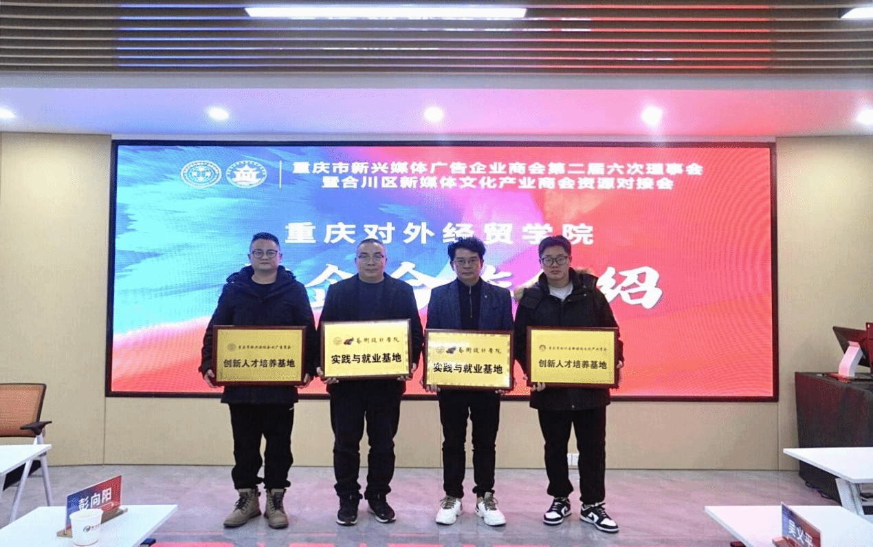 会上,马乐副院长向商会会员企业单位详细介绍了学院概况、学科情况、毕业生综合能力素质及职场优势。他表示,学院一直致力于推动教育与实践相结合,期待与各企业搭建产、教、用战略合作关系,共进共赢。随后,马乐副院长与周老师代表艺术设计学院同重庆市新兴媒体企业广告商会及重庆市合川区新媒体文化产业商会进行学院“实践与就业基地”、商会“创新人才培养基地”授牌仪式。