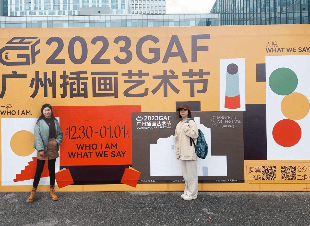 丁扬老师和莫雨老师在广州插画艺术节海报前合影留念