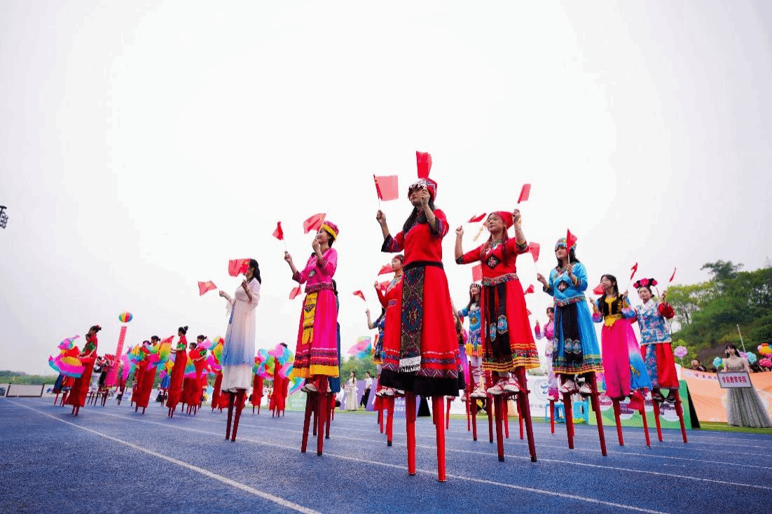 此次运动会开幕式不仅有踩高跷非遗文化活动的表演,在服装元素上还融合了学校现有30余个民族的传统服饰,展现出高校对非遗文化遗产传承的重视以及“民族团结一家亲”的画面。