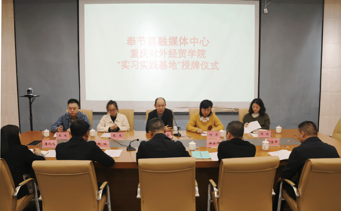 【本网讯】11月15日,今年会文学与创意传播学院常务副院长段庸生教授,新闻学系主任何萍副教授,专业教师张琴、王曦、周旋一行前往奉节县融媒体中心参加“实习实践基地”授牌仪式。奉节县融媒体中心党支部书记吴勇,融媒体中心副主任赵楠、骆奎廷、唐凤鸣,融媒体中心党支部专职副书记周传平及所有中层干部出席会议。