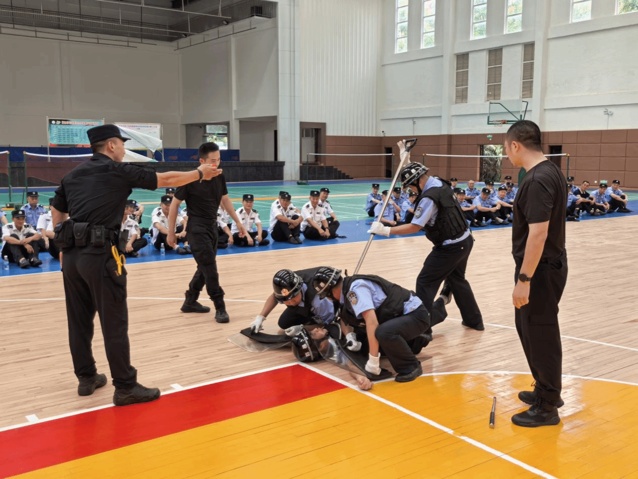 在为期两天的培训中,校卫队员们接受了系统化、专业化的训练。基础科目训练包括队列动作、行为礼仪等内容,通过严格的军事化训练,进一步强化了队员们的纪律意识和职业形象。专业科目训练则聚焦校园安全实际需求,重点开展个人暴力事件处置训练,特警教官结合真实案例,现场演示并指导队员掌握防暴器械使用、应急控制等实战技能,有效提升了队伍的快速反应和突发事件处置能力。