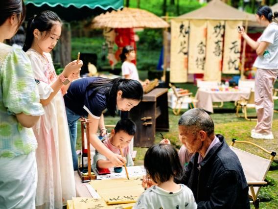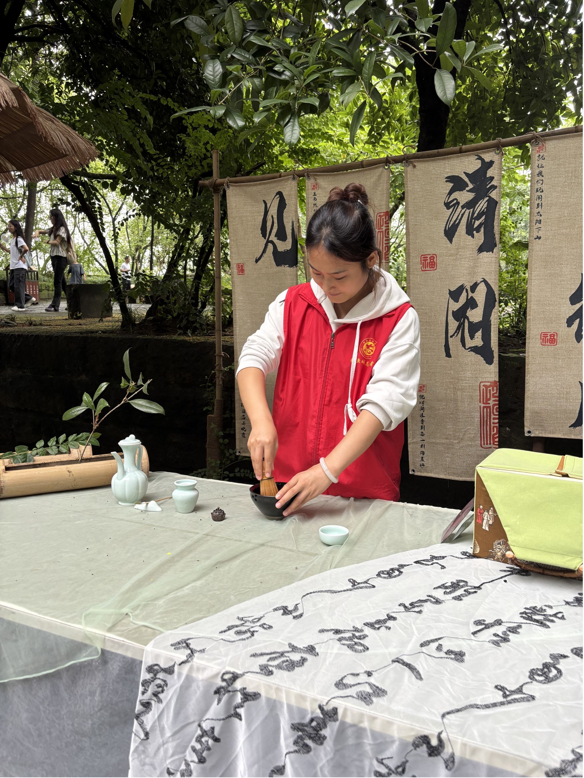 时值国庆旅游高峰,景区游人如织。活动中,同学们身着汉服,亲身沉浸于钓鱼城深厚的历史文化氛围之中,其古典风韵也为景区增添了独特的活力与风采。同时,学生志愿者团队在护国坪专门设立了文化体验区,面向广大游客提供书法展示、宋代点茶技艺演示与品茗交流等富有传统文化特色的讲解与体验服务。这一系列互动不仅丰富了游客的游览体验,更锻炼了学生的组织协调、文化讲解与现场服务能力。