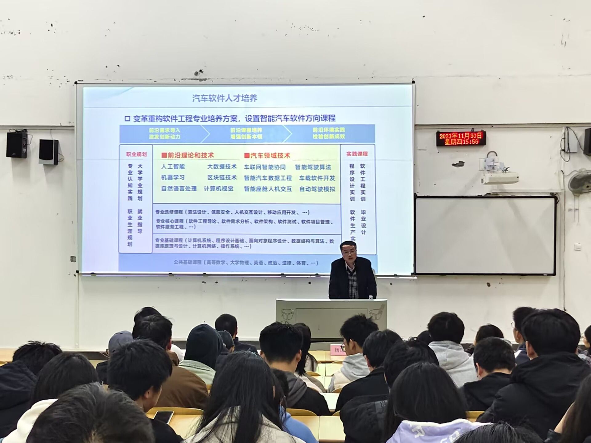 随着AI、大数据、云计算等技术的不断进步,智能软件将变得更加智能化、高效化和自适应,汽车不仅是出行工具,更是智能生态系统的一部分。为更好地了解智能网联汽车软件及其研发的最新动态,提高学院学子对该项技术的认知与了解。数学与计算机学院于2023年11月30日下午,邀请重庆大学大数据与软件学院硕士生导师杨正益到合川A校区A6116教室开展“智能网联汽车软件及其研发”的学术讲座,本次讲座由数学与计算机学院院长陈东升主持。