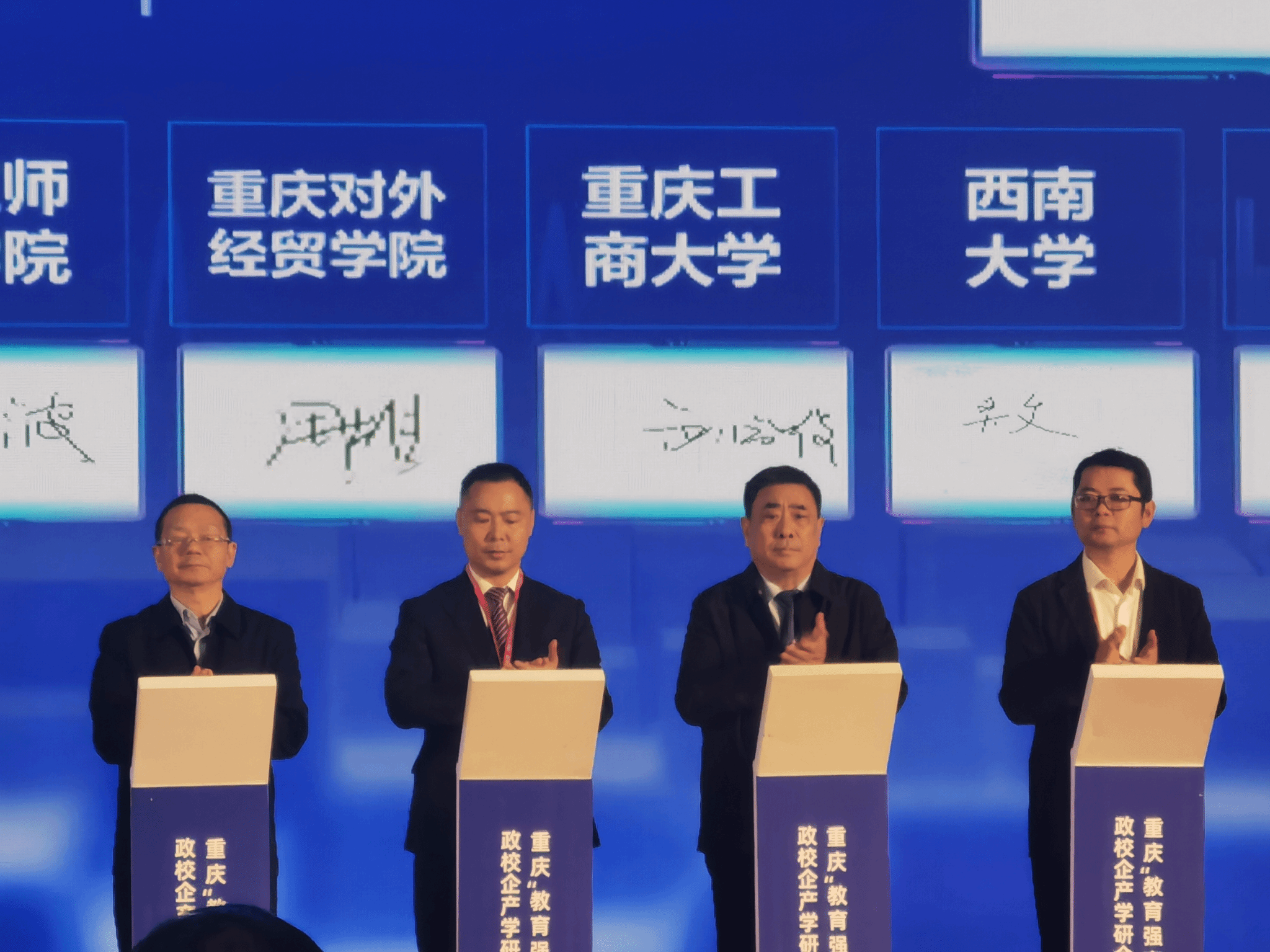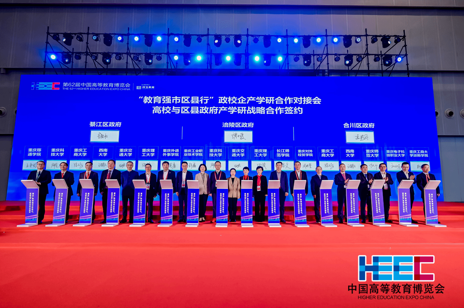 2024年11月16日,“教育强市区县行”政校企产学研合作对接会在第62届中国高等教育博览会重庆国际博览中心中央大厅举行。周明星副校长代表学校与合川区签署了战略合作协议,深入推动产学研用一体化,为培育发展新质生产力提效增速。科研处、学科办、发规处、团委、博士后科研工作站参加了政校企产学研合作对接会。
