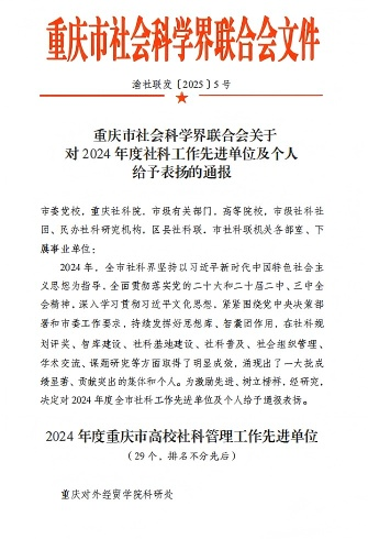 近日,重庆市社会科学界联合会发布《重庆市社会科学界联合会关于对2024年度社科工作先进单位及个人给予表扬的通报》(渝社联发〔2025〕5号),今年会科研处荣获2024年度重庆市高校社科管理工作先进单位。