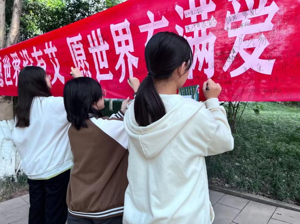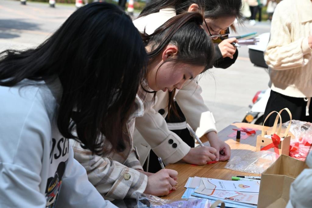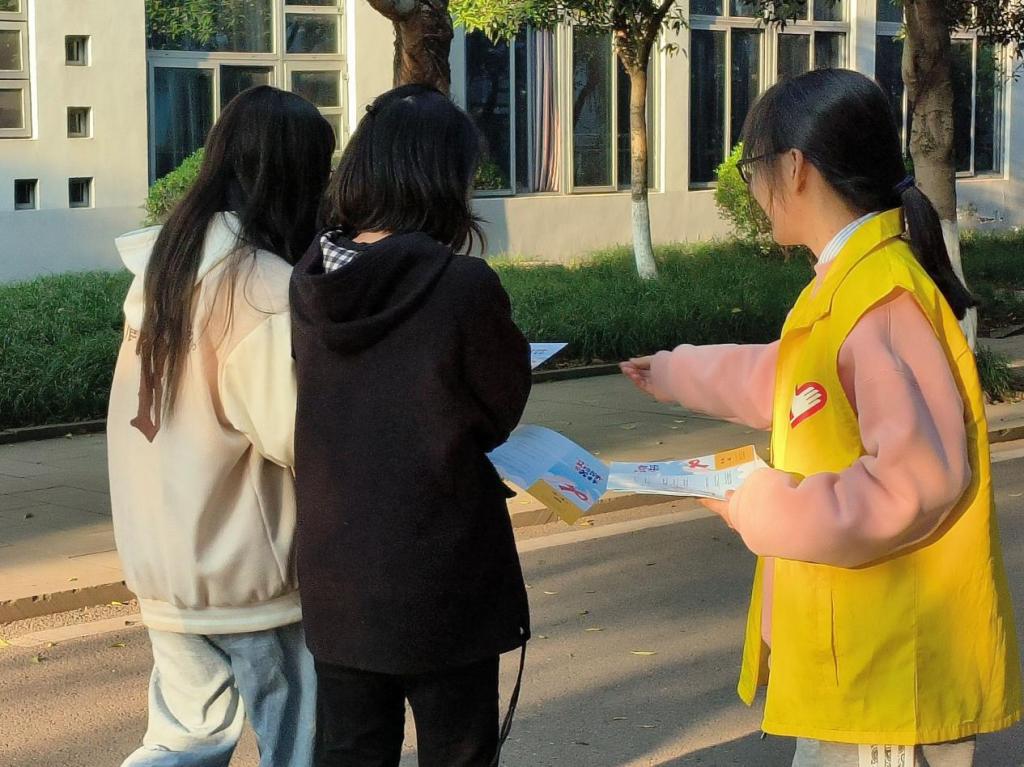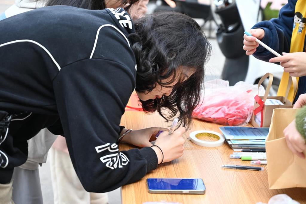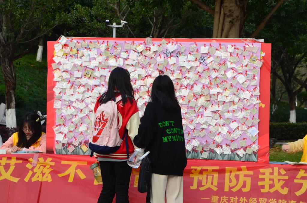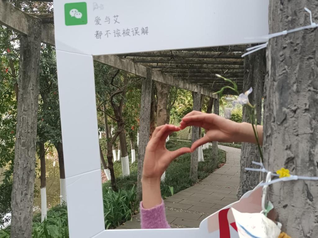 明信片带着红丝带,在校园里传递着艾滋病的相关知识,让同学们在寻找中牢记。原本观望的同学们,也拿起了笔,防住了“艾”,留下了一颗颗稚嫩而又坚定的心。树叶在一旁飒飒作响,空气中伴着清新草香。形式各样的拍照框在荷花池旁环绕,伴随着一份份有温度的名字与话语,在展板上迎风而起。精致的小礼品,用心的宣传册,热情的志愿者,引来了老师与同学们的驻足围观。