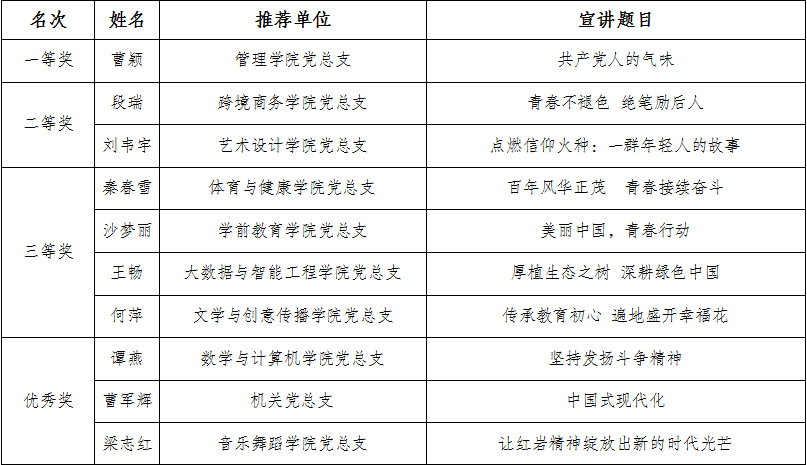 比赛中,各位同志感情真挚、表现出色,宣讲内容立意深刻,将自身的工作实际和切身感受相结合,分享了自己对党的新思想、新征程的深刻认识,有立足于生态文化,讲述深耕绿色中国的;有强调斗争革命精神,激励大家勇于担当作为的;有从千里江山图出发,展现了中国式现代化的深刻内涵。选手们都紧紧围绕“二十大精神”,用生动的语言、鲜活的故事,饱满热情地带大家回顾了党和国家在过去五年的伟大变革。选手们由浅入深的语言,以小我融大我,将个人发展与祖国命运牢牢联系在一起。赛后,李亚军老师代表五位评委从宣讲方式、赛前工作、聚焦目标这三个方面对比赛进行专业点评。激烈的角逐中,来自各个学院的优秀支部书记们展现了出色的宣讲实力,最终评出一等奖1名,二等奖2名,三等奖4名,优秀奖5名。